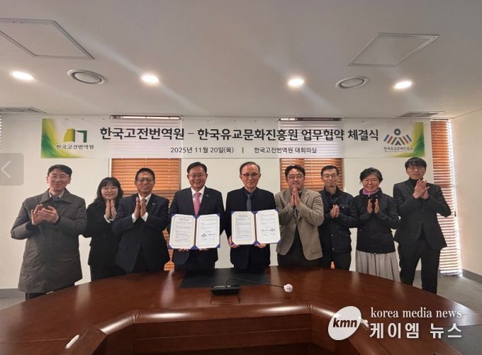 (케이엠뉴스) 한국유교문화진흥원과 한국고전번역원은 11월 20일, 양 기관의 상생 발전을 위한 업무협약을 한국고전변역원 대회의실에서 체결했다.
