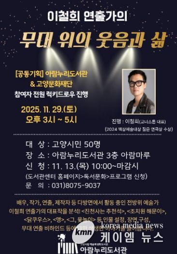(케이엠뉴스) 고양특례시 아람누리도서관은 오는 29일 오후 3시, 2024년 제60회 백상예술대상 젊은 연극상 수상자인 이철희 연출가를 초청해 예술특성화 프로그램 ‘무대 위의 웃음과 삶’을 운영한다.