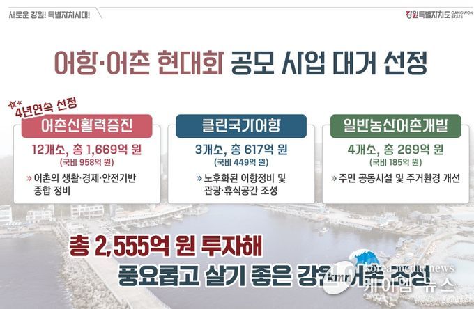 (케이엠뉴스) 강원특별자치도는 해양수산부가 추진하는 어항・어촌 현대화 공모사업에 대거 선정됨에 따라, 2030년까지 총 2,555억 원(국비 1,592억 원)을 투입해 살기 좋은 강원어촌을 비전으로 본격적인 어촌 대전환을 추진하겠다고 밝혔다.