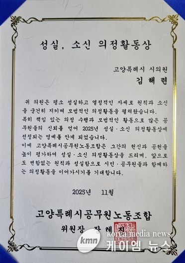 (케이엠뉴스) 고양특례시의회 건설교통위원회 김해련 의원(일산2동·정발산동·중산1·2동)은 21일 열린 고양시공무원노동조합 ‘2025년도 베스트시의원상’을 4년 연속 수상했다.