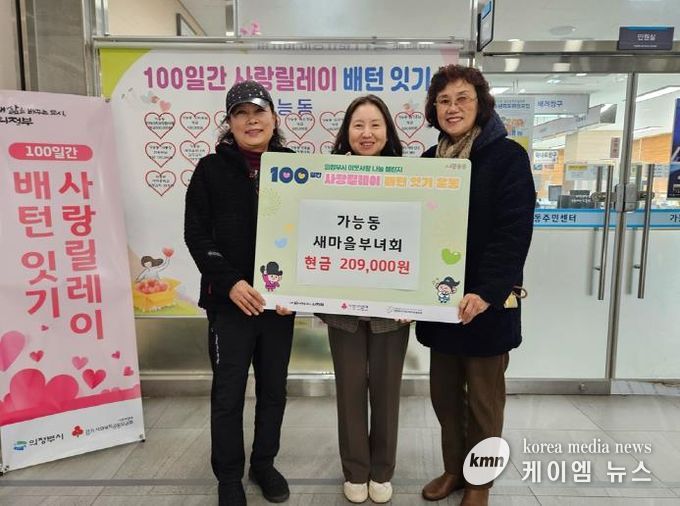 (케이엠뉴스) 의정부시 가능동주민센터는 11월 26일 가능동 새마을부녀회가 지역 내 어려운 이웃을 돕기 위해 성금 20만9천 원을 기탁하며 ‘100일간 사랑릴레이 배턴 잇기’에 동참했다고 밝혔다.