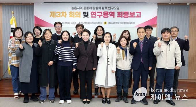 (케이엠뉴스) 충남도의회 ‘농촌지역 공동체 활성화 정책 연구모임’(대표 박미옥)은 지난 27일 도의회에서 제3차 회의 및 연구용역 최종보고회를 열고, ‘충남형 농촌 서비스 통합모델’ 구축 방향을 심도 있게 논의했다.