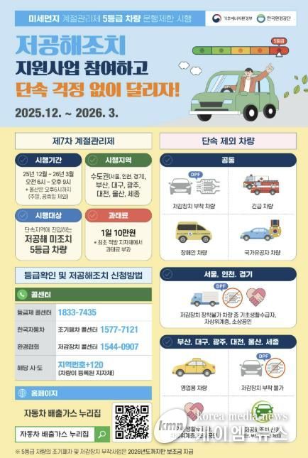 (케이엠뉴스) 구리시는 12월부터 내년 3월까지 미세먼지 관리를 강화하고 시민 건강을 보호하기 위해 ‘제7차 미세먼지 계절 관리제’를 시행하며, 이 기간에 노후 경유차 배출가스 5등급 차량의 운행을 제한한다고 밝혔다.