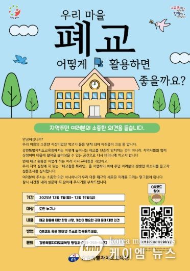 (케이엠뉴스) 강원특별자치도교육청은 오는 12월 1일부터 12월 19일까지 폐교 재산의 효율적 활용을 위한 ‘폐교활용 특례안 마련 설문조사’를 실시한다고 밝혔다.
