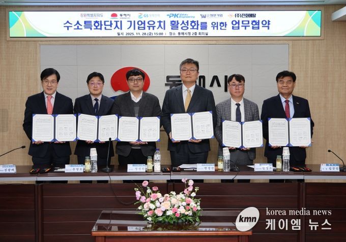 (케이엠뉴스) 강원특별자치도는 11월 28일 동해시청 본관 회의실에서 동해시, ㈜GS동해전력, 피케이밸브앤엔지니어링㈜, ㈜성원기업, ㈜진화메탈과 함께 수소특화단지 기업유치 활성화 및 수소산업 육성을 위한 업무협약(MOU)을 체결했다고 밝혔다.