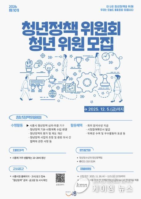 (케이엠뉴스) 시흥시는 청년들의 다양한 목소리를 들을 수 있는 제10기 시흥시 청년정책위원회 청년위원을 오는 12월 5일까지 공개 모집한다.