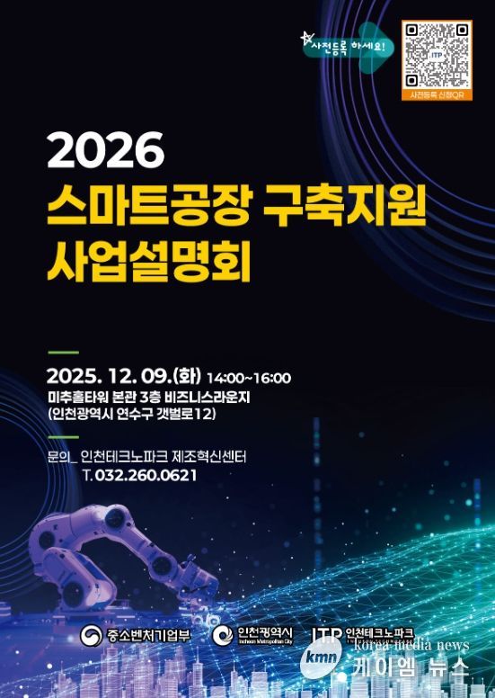 (케이엠뉴스) 인천테크노파크(인천TP)는 오는 9일 오후 2시 송도 미추홀타워 3층 인천기업경영지원센터에서 스마트공장 도입을 희망하는 중소·중견 제조기업을 대상으로 ‘2026년도 스마트공장 구축지원 사업설명회’를 개최한다고 밝혔다.