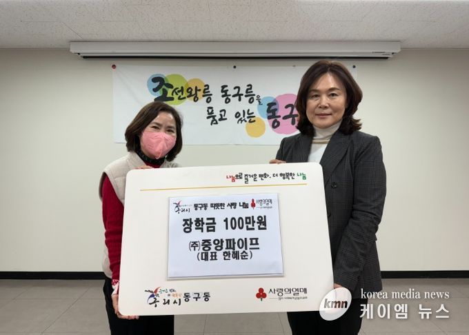 (케이엠뉴스) 구리시 동구동은 지난 5일 동구동 행정복지센터 대회의실에서 ㈜중앙파이프로부터 취약계층 학생을 위한 장학금 100만 원을 전달받았다고 밝혔다.