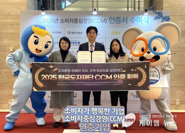 (케이엠뉴스) 한국도자재단이 12일 서울 서초구 엘타워에서 열린 ‘2025년 소비자중심경영 우수기업 포상 및 인증서 수여식’에서 공정거래위원회가 인증하고 한국소비자원이 운영하는 ‘2025년 소비자중심경영(CCM) 인증’을 획득했다.