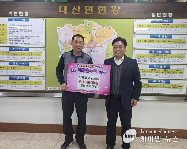 이상윤 대신면장은 “이웃을 먼저 생각하는 안출환 이장님의 따뜻한 마음에 깊이 감사드린다”며 “기탁해 주신 성금은 도움이 절실한 이웃들에게 소중히 전달하여, 지역사회에 온기가 퍼질 수 있도록 하겠다”고 말했다.