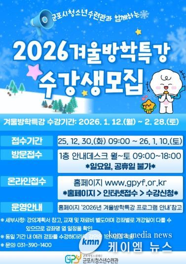 (케이엠뉴스) (재)군포시청소년재단 군포시청소년수련관은 2026년 1월 12일부터 2월 28일까지 겨울방학을 맞아 문화·체육 분야 겨울방학특강 프로그램을 운영한다.
