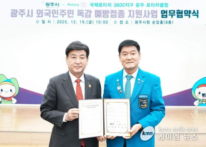 (케이엠뉴스) 광주시와 국제로타리 3600지구 광주 로타리클럽은 19일 외국인 주민의 건강 보호와 독감 예방을 위한 ‘외국인 주민 독감 예방접종 지원사업’ 추진에 관한 업무협약(MOU)을 체결했다.