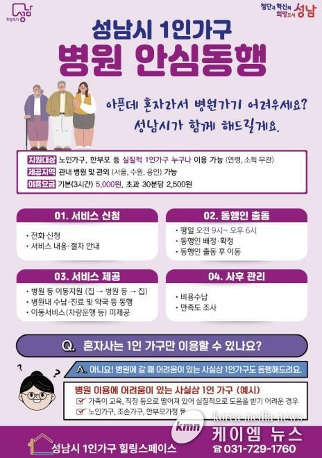 (케이엠뉴스) 성남시는 ‘1인 가구 병원 안심 동행 서비스’ 추진을 위해 전문 인력을 기존 4명에서 5명으로 늘렸다고 22일 밝혔다.