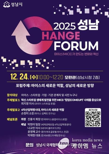 (케이엠뉴스) 성남시는 오는 12월 24일 오전 10시 성남시청 모란관에서 ‘2025 성남 체인지 포럼(CHANGE Forum)’을 개최한다.