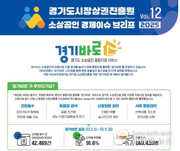 (케이엠뉴스) 경기도시장상권진흥원은 22일, 도내 소상공인의 행정 편의와 정보 접근성을 높이기 위해 운영 중인 경기도 소상공인 종합지원 서비스 ‘경기바로’의 현황과 향후 개선 방향을 담은 「경기도 소상공인 경제 이슈 브리프 VOL.12」을 발간했다고 밝혔다.