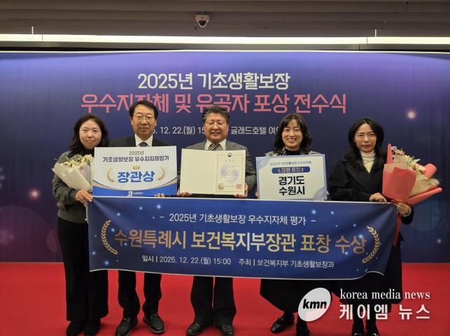 (케이엠뉴스) 수원특례시가 보건복지부 주관 ‘2025년 기초생활보장·긴급지원 사업’ 평가에서 우수 지자체로 선정돼 보건복지부 장관 표창을 받았다. 시상식은 22일 서울 글래드호텔에서 열렸다.