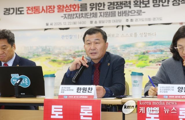 (케이엠뉴스) 경기도의회 경제노동위원회 소속 한원찬 의원(국민의힘, 수원6)은 22일 수원특례시 팔달구청 대강당에서 개최된 ‘경기도 전통시장 활성화를 위한 경쟁력 확보 방안 정책 토론회’에 토론자로 참석했다. 이번 토론회는 지방정부의 전통시장 및 상점가 육성을 위한 지원 방안 개선책을 모색하고, 경기도 전통시장이 단순한 활성화를 넘어 실질적인 경쟁력을 확보하기 위한 전략을 논의하고자 마련됐다.