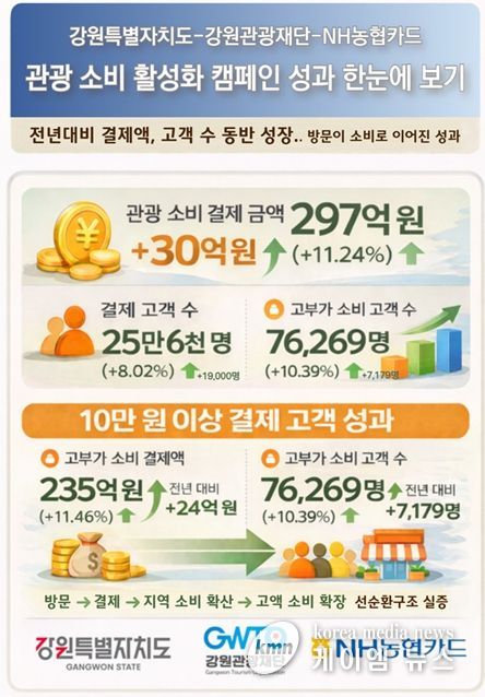 (케이엠뉴스) 강원특별자치도와 강원관광재단은 NH농협카드와 함께 추진한 ‘강원 관광소비 활성화 상생 캠페인’ 결과, 전년 동일 기간 대비 관광 소비 금액과 결제 고객 수가 모두 증가하며 실질적인 지역 소비 활성화 성과를 거둔 것으로 나타났다.