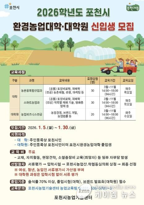 (케이엠뉴스) 포천시는 2026년 1월 5일부터 30일까지 ‘2026학년도 포천시 환경농업대학 및 대학원’ 신입생을 모집한다.