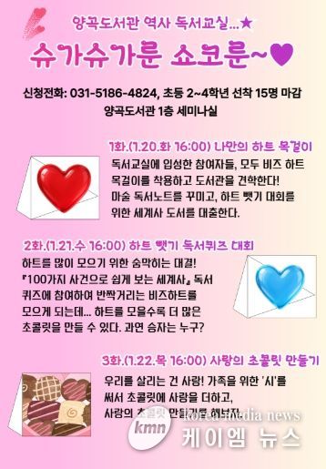 (케이엠뉴스) 김포시는 2026년 1월 20일 오후 4시부터 6시까지 1층 세미나실에서 초등학교 2~4학년을 대상으로 한 역사 독서교실 '슈가슈가룬 쇼코룬'을 운영한다.