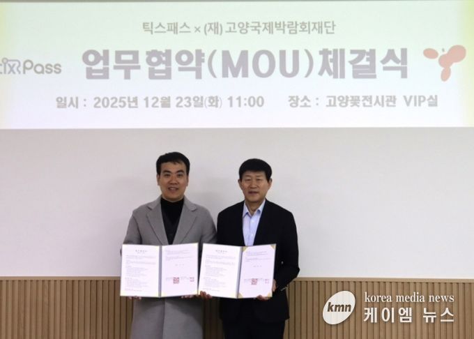 (케이엠뉴스) (재)고양국제박람회재단은 지난 23일 고양꽃전시관에서 틱스패스 주식회사와 2026고양국제꽃박람회 모바일 입장권 도입을 위한 업무협약을 체결했다고 밝혔다.