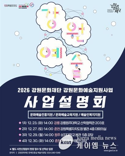 (케이엠뉴스) 강원문화재단은 2026년 강원문화예술지원사업의 주요 내용과 변경 사항을 도내 예술인에게 종합적으로 안내하기 위해 ‘2026년 강원문화예술지원사업 통합 설명회’를 개최한다고 밝혔다.