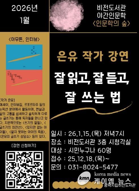 (케이엠뉴스) 평택시 비전도서관은 다음 달 1월 15일 저녁 7시 은유 작가를 초청하여 ‘잘 읽고, 잘 듣고, 잘 쓰는 법’을 주제로 야간 인문학 강연을 진행한다.