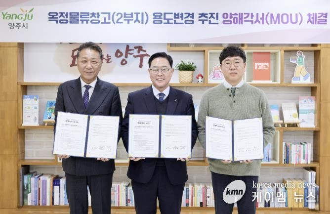 (케이엠뉴스) 양주시가 26일 시청 시장실에서 옥정물류창고 2부지 사업 취소와 용도변경 추진을 위한 양해각서를 체결했다.