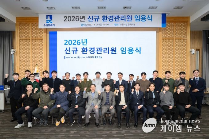 (케이엠뉴스) 수원특례시가 26일 시청 중회의실에서 2026년 신규 환경관리원 임용식을 열고, 신규 임용자 21명에게 임용장을 수여했다.