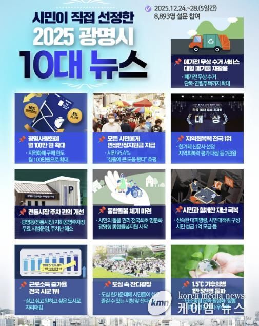 (케이엠뉴스) #광명시민이 직접 뽑은 2025년 10대 뉴스의 한 줄 평은 ‘위기 속에서도 흔들리지 않는 지속가능한 광명’이다. 고물가와 경기 둔화, 기후위기와 안전 불안이 이어진 한 해 속에서 광명시는 단기 성과보다 도시가 오래 버틸 수 있는 힘을 키우는 데 시정의 중심을 뒀다. 민생경제 대응부터 탄소중립, 돌봄·안전·공동체를 아우르는 구조적 변화까지 이어진 시정의 방향은 시민이 선정한 10대 뉴스에 고스란히 담겼다. 이는 2025년 광명시가 무엇에 집중했고, 어떤 기반을 다져왔는지를 분명히 보여준다.