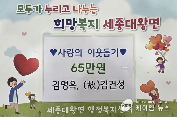 (케이엠뉴스) 지난 29일 세종대왕면 구양리에 거주하는 김영옥, (故)김건성께서 관내 어려운 이웃을 위한 성금 65만원을 세종대왕면 지역사회보장협의체에 기탁했다.