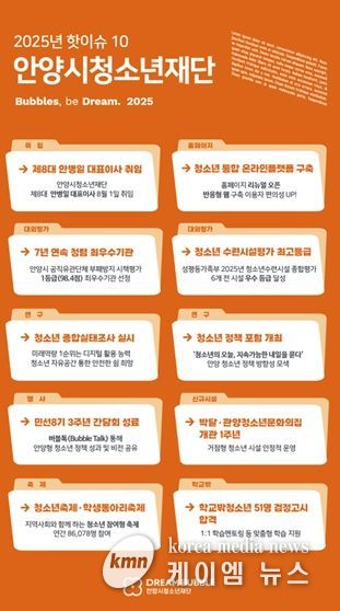 (케이엠뉴스) 안양시청소년재단은 올 한 해를 돌아보는 ‘2025년 안양시 청소년재단 핫이슈 10’을 선정하고, 2025년 청소년 정책 컨트롤타워로서의 기능을 강화해 청소년 체감형 정책 성과를 거뒀다고 30일 밝혔다.