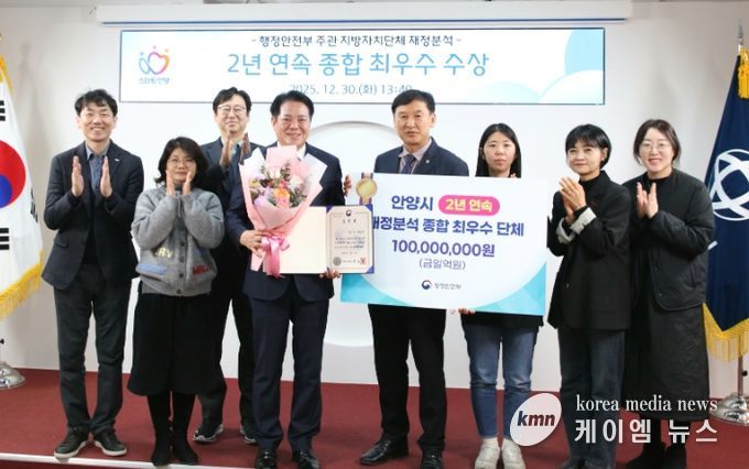(케이엠뉴스) 안양시는 행정안전부에서 실시한‘2025년(2024 회계연도) 지방재정분석’에서 종합점수 ‘가’등급을 받아 2년 연속‘종합 최우수’지자체로 선정됐다.