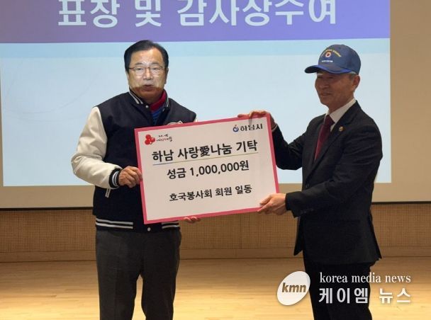 (케이엠뉴스) 지난 27일, 하남호국봉사회(회장 박규섭)는 ‘하남 사랑愛나눔’ 성금으로 100만원을 하남시에 기탁하며 지역사회 나눔 실천에 동참했다.