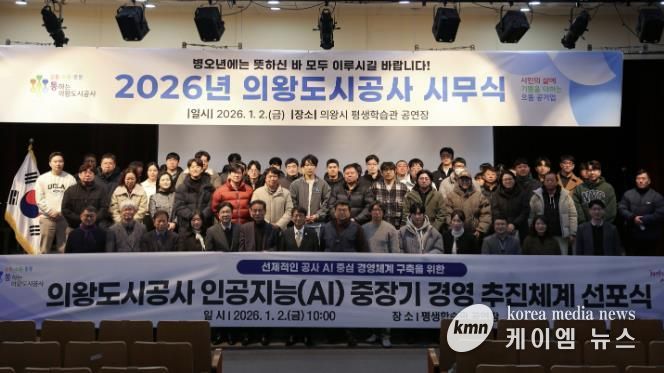 (케이엠뉴스) 의왕도시공사가 1월 2일, 평생학습관 공연장에서 개최된 시무식에서 인공지능(AI) 경영 문화 확산을 위한 ‘인공지능 중장기 경영 추진체계 선포식’을 개최했다.