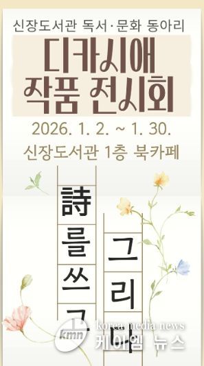 (케이엠뉴스) 하남시는 신장도서관이 독서문화 동아리 ‘디카시애’의 창작 작품을 한자리에서 만나볼 수 있는 전시회를 연다고 2일 밝혔다. 전시는 2026년 1월 30일까지 신장도서관 1층 북카페에서 열린다.