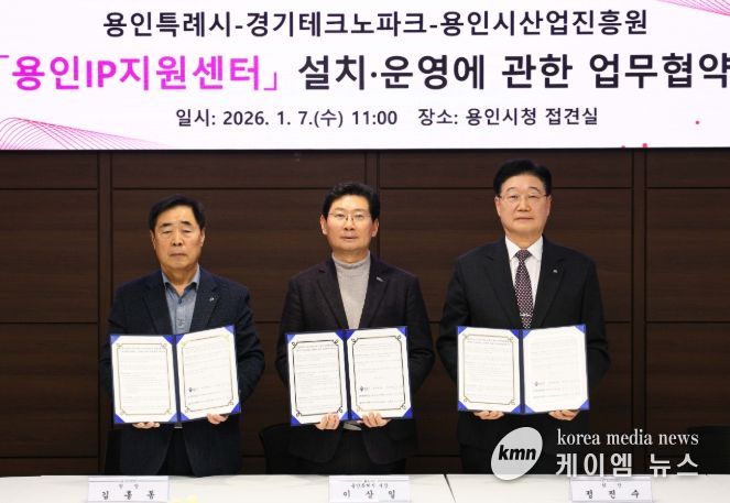 (케이엠뉴스) 용인특례시는 7일 시청 접견실에서 경기테크노파크, 용인시산업진흥원과 '용인IP지원센터 운영에 관한 상호협력 협약'을 체결했다.