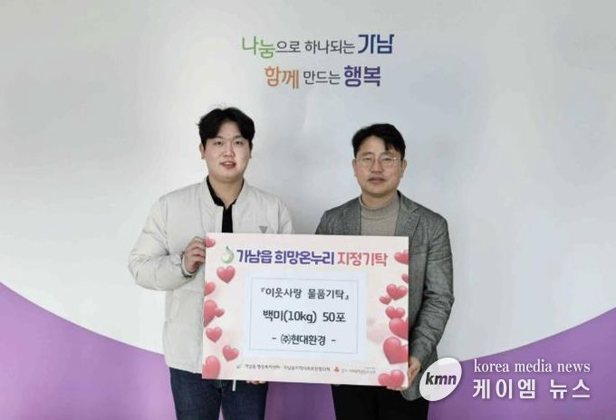 (케이엠뉴스) 현대환경㈜은 지난 8일, 가남읍 행정복지센터를 방문해 관내 취약계층을 위한 백미(10kg) 50포를 기탁했다.