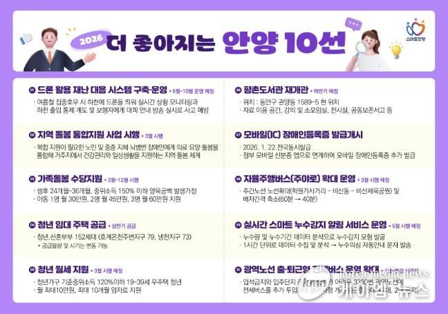 안양시(시장 최대호)는 ▲드론 활용 재난 대응시스템 구축·운영 ▲지역 돌봄 통합지원사업 시행 ▲가족돌봄수당 지원 ▲청년임대주택 공급 ▲안양시 청년월세 지원(사업대상 확대) ▲평촌도서관 재개관 등 ‘2026년 더 좋아지는 안양 10선’을 12일 소개했다.