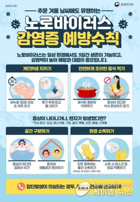 노로바이러스는 오염된 음식이나 물 섭취뿐만 아니라 사람 간 접촉, 오염된 손과 환경을 통해서도 전파되므로 개인위생 관리가 무엇보다 중요하다. 외출 후와 화장실 이용 후, 조리 및 식사 전에는 반드시 비누로 30초 이상 손을 씻어야 하며, 어패류 등 식품은 충분히 가열해 섭취하고 조리기구는 사용 후 즉시 세척·소독해야 한다.