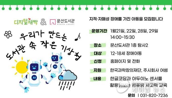 (케이엠뉴스) 파주시 문산도서관은 한국과학창의재단의 ‘디지털새싹’교육지원 사업의 일환으로, 지적·자폐성 장애 아동을 위한 인공지능 교육 프로그램 ‘우리가 만드는 도서관 속 작은 기상청’을 운영한다.