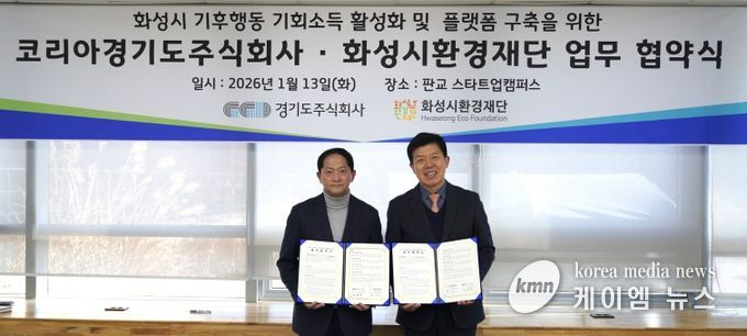 (케이엠뉴스) 경기도주식회사는 13일 경기도 성남시 판교 스타트업캠퍼스에서 화성시환경재단과 ‘기후행동 기회소득 활성화 및 화성시 플랫폼 구축을 위한 업무협약’을 체결했다.