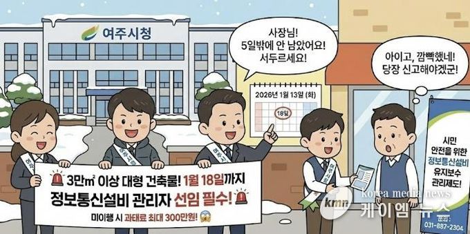 현재 여주시 내 연면적 3만㎡ 이상인 대형 건축물의 관리주체는 오는 2026년 1월 18일까지 정보통신설비 유지보수 관리자를 선임하고 지자체에 신고를 완료해야 합니다.