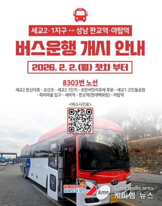 이번에 신설되는 8303번 버스는 하루 2대가 투입돼 총 8회 운행된다. 세교1·2지구를 비롯한 오산 주민들의 수도권 남부 이동 편의를 크게 높일 것으로 기대된다. 특히 성남 판교·야탑 방면 직행 노선에 대한 시민들의 지속적인 요구를 반영해 마련된 노선이라는 점에서 의미가 크다.