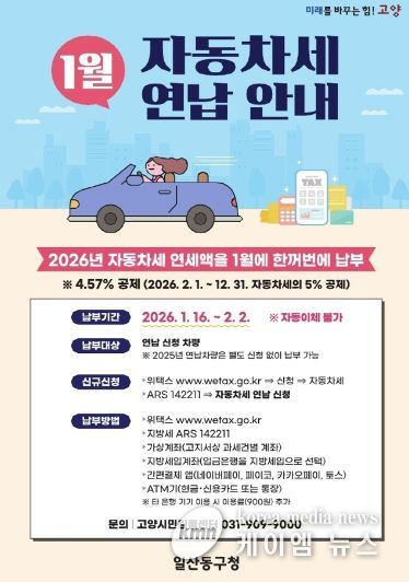 (케이엠뉴스) 고양특례시 일산동구 세무과는 1월에 자동차세를 연납하면 1년 세액의 약 4.5%를 공제받을 수 있는 연납 신청기간을 1월 한 달간 운영한다고 밝혔다.