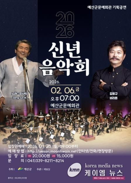 (케이엠뉴스) 예산군은 군민과 함께 희망찬 2026년 새해를 여는 ‘2026년 신년 음악회’를 오는 2월 6일 오후 7시 예산군문예회관 공연장에서 개최한다고 밝혔다.