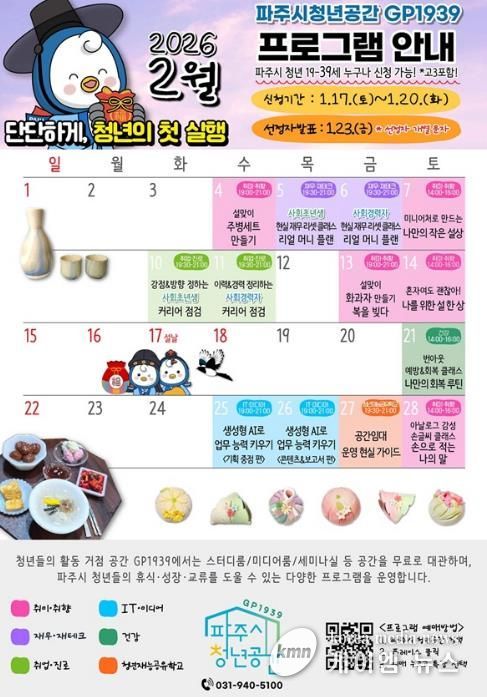 (케이엠뉴스) 파주시청년공간 지피(GP)1939가 오는 2월 한 달간 청년을 위한 맞춤형 프로그램에 참여할 참여자를 모집한다.