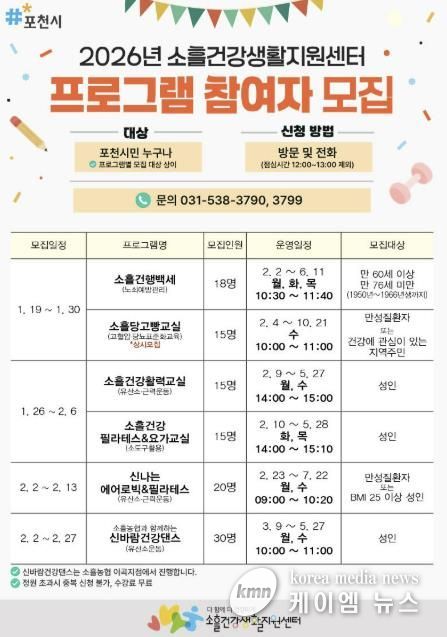 (케이엠뉴스) 포천시 소흘건강생활지원센터는 시민들의 건강 증진과 활기찬 일상 지원을 위해 오는 19일부터 ‘2026년 상반기 건강증진 프로그램’ 참여자를 모집한다.