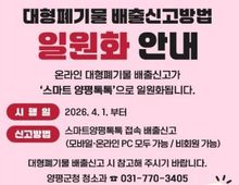 (케이엠뉴스) 양평군은 오는 4월 1일부터 주민 편의 증진과 행정 효율성 강화를 위해 온라인 대형폐기물 배출신고 시스템을 모바일 행정 플랫폼 ‘스마트 양평톡톡’으로 통합 운영한다고 밝혔다. 이번 통합 운영은 기존에 양평군청 누리집과 ‘스마트 양평톡톡’으로 나뉘어 운영하던 방식을 개선한 것으로, 주민들은 ‘스마트 양평톡톡’ 앱 또는 웹을 통해 대형폐기물 배출신고부터 수수료 결제, 배출 및 수거 일정 확인까지 한 번에 처리할 수 있어 서비스 이용이 한층 편리해질 것으로 기대된다. 특히 기존에는 카카오톡을 사용하지 않는 주민의 경우 서비스 이용에 제약이 있었고 본인 인증도 필수였으나, 이번 통합 운영으로 컴퓨터를 통한 배출신고와 비회원 신고가 가능해져 시간과 장소에 구애받지 않고 서비스를 이용할 수 있게 됐다. 또한 양평군청 누리집을 통한 대형폐기물 배출신고 서비스는 3월 31일까지 병행 운영되며, 군은 주민 불편을 최소화하기 위해 다양한 홍보 매체를 통해 적극적으로 안내할 계획이다. 또한, 군은 ‘이순환거버넌스’를 통한 대형 폐가전 무상 수거 서비스도 지속적으로 운영하고 있다. 냉장고, 세탁기, 에어컨, 텔레비전