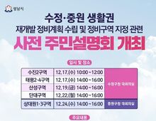(케이엠뉴스) 성남시는 오는 12월 17일 수진2구역을 시작으로 수정·중원 생활권 5개 구역의 재개발 정비계획 수립 및 정비구역 지정에 대한 사전 주민설명회를 순차적으로 개최한다. 이번 주민설명회는 지난 9월 23일 착수한 수진2, 태평2‧4, 산성, 단대, 상대원1‧3 등 5개 구역의 ‘재개발 정비계획 수립 및 정비구역 지정 용역’을 통해 검토된 각 구역의 정비계획안과 추정분담금에 대한 주민 의견을 청취하기 위해 마련됐다. 정비계획안에는 각 구역의 토지이용계획, 도시계획시설 및 생활인프라(SOC) 확충 방안, 건축물 계획 등이 포함된다. 사전 주민설명회 일정은 17일 오전 10시 수진2구역, 오후 2시 태평2‧4구역을 비롯해, 19일 오후 2시 산성구역과 22일 오후 2시 단대구역 설명회가 수정구청 대회의실에서 진행된다. 24일 오후 2시에는 상대원1‧3구역 설명회가 중원구청 대회의실에서 열린다. 주민설명회는 별도의 사전 등록 없이 해당 구역 토지등소유자를 비롯해 재개발 사업에 관심 있는 주민 누구나 참석할 수 있다. 신상진 성남시장은 “정비계획 수립 단계에서 주민과 의견을 나누는 과정은 사업의